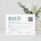Cartão RSVP de casamento teal elegante com um código de QR digitalizável para o site e 3 opções de refeições editáveis. O exemplo inclui cardápios de carne, peixe e vegano, mas pode ser mudado para qualquer outro texto. Personalize com seu próprio texto.