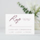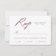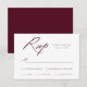 Cartão RSVP de casamento simples com "RSVP" exibido em um script de caligrafia moderno com fundo branco (ou cor de sua escolha). Personalize a placa RSVP burgundy com a data de resposta desejada, o personalizado aceita/declina a redação e introduz opções. O cartão RSVP de Caligrafia Burgundy foi projetado para coordenar com nossa coleção de casamento Elegante Calliografia.