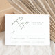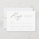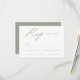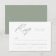 Cartão RSVP de casamento simples com "RSVP" exibido em um script de caligrafia verde moderno com fundo branco (ou cor de sua escolha). Personalize o cartão verde Sage RSVP com a data de resposta desejada, o personalizado aceita/declina o texto e introduz opções. O cartão RSVP da caligrafia verde de sábio foi projetado para coordenar com nossa coleção de casamento Elegante Calliografia.