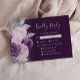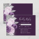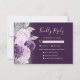 A borda esquerda deste elegante cartão RSVP de casamento moderno apresenta um buquê floral em tons de roxo e lavanda, cortado com folha de falso prateado e folhagem falsa e borrifada com cintilação de prata. O texto personalizável, incluindo opções de opções de refeições, combina o script de escrita manual de cinzas prateadas pálidas e a fonte de impressão em fundo roxo profundo. O verso apresenta um design floral correspondente.
