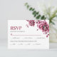 Cartão de resposta RSVP de casamento floral chinês floral Burgundy. Esta placa RSVP de casamento apresenta um design cativante onde florescências de peônias exuberantes são renderizadas em um estilo paixão que lembra pinturas de tinta clássica. Uma rica paleta de burgundy profunda, rosa azulado e branco cria uma estética sofisticada e inspirada culturalmente. Perfeito para casais que apreciam elegância refinada com uma bela mistura de patrimônio e estilo contemporâneo, o reverso da carta apresenta uma matiz sólida e complementar para um acabamento polido.