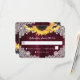 Cartão de confirmação de casamento borgonha elegante com girassóis em um fundo de madeira de celeiro adornado com renda floral delicada e luzes de corda. Dois corações de aniagem na parte de trás. Design de cartão perfeito para complementar sua festa de casamento rústica borgonha inspirada em flores de girassol.