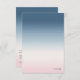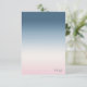 O pano de fundo de todas as peças neste conjunto de casamento minimalista é um gradiente de cores que se chama de azul prussiano a rosa macio e branco. A placa RSVP de casamento mostrada aqui apresenta um layout moderno e elegante e fonte sans serif contemporânea para adicionar ao seu apelo. Adicione facilmente os detalhes do evento usando o modelo fornecido. Procure ID741 para ver o conjunto completo de produtos correspondentes no Céu Prussiano ou escolha uma das outras combinações de gradiente disponíveis para se adequar à paleta de cores do casamento.