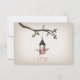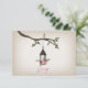 Uma r.s.v.p. de casamento ao ar livre com uma ilustração de uma lanterna cheia de um arranjo de flores cor-de-rosa pendurado num galho de árvore com folhas verdes.