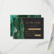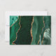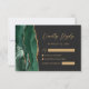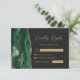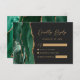 Este cartão RSVP de casamento moderno apresenta uma borda esmeralda verde aquosa agate, aparada com brilho dourado num fundo preto ardente. O texto está em um roteiro de caligrafia moderna de cor dourada e fonte sans serif, com espaços para nomes e respostas de convidados. O verso apresenta um design emerald verde e dourado.