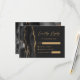A borda esquerda desta elegante e moderna placa RSVP de casamento apresenta uma borda preta de aquarela, aparada com falso brilho dourado. O texto está em um script de cor dourada e um tipo de letra copperplate em um fundo preto de slate. O verso apresenta um design de agate preto e dourado correspondente.