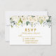 Watercolor Ivory White Floral Greenery Wedding RSVP Card inclui rosas brancas de creme de marfim e verde botânico. Dourado Script, Azul Dusty De Trás