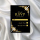 Placa RSVP de Casamento Dourado e Preto Chico Luxurioso com script de caligrafia e design de sotaque de joia dourada.