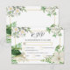 Um belo design de verde rústico com floral branco e uma elegante armação de ouro. Um cartão de resposta de RSVP de casamento botânico moderno com flores brancas, folhas verdes e sotaques dourados, ideal para qualquer casamento temático. Os convites de casamento e outros artigos de papelaria também estão disponíveis.