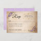 Em busca de ideias encantadoras para uma celebração de conto de fadas? Crie suas próprias placas RSVP elegantes em uma bela mistura de tons roxos leves e dourados, complementando seus convites personalizados para os convidados responderem. Ilustrada por Raphaela Wilson, a obra de arte original mostra um calçado de serra Cinderella (salto alto) branco adornado com sotaques de ouro metálicos falsos em rosas, ornamentos de ricos e borboletas delicadas, colocados contra um pano de fundo de papel de pergaminho rústico e velho. Este modelo do DIY, editável e fácil de seguir, é perfeito para casamentos de contos de fadas, uma quinceañera com tema de princesa ou uma bola de 16 anos de doce lilás, assim como, uma vez por outra, noivas e chás de fraldas, e outras ocasiões encantadoras. O reverso destes cartões RSVP de casamento de lavandas oferece espaço amplo para uma nota manuscrita que transmite desejos quentes, um URL de site ou um código QR. Sinta-se à vontade para personalizar ainda mais este design chic, reposicionando a arte para acomodar vários detalhes, como opções de refeições ou outras informações importantes para seus convidados. Você também pode modificar a caligrafia do script e as fontes modernas para corresponder ao seu estilo de tipografia preferido. Categoria: cartões lilac quinceanera da borboleta; cartões rsvp de casamento roxos leves com flores; e convites rsvp de resposta floral do Rapunzel. Cores tradicionais do tema lilás e marmelos dourados: roxo claro, lavanda, lilac pastel, bronzeado, castanho-claro-rústico, bege, ouro-champanhe amarelo, preto e branco.