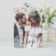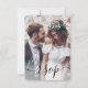 Compartilhe uma de suas fotos de noivado ou casamento com esses cartões de RSVP elegantes e versáteis. Imagem e todo texto são simples de personalizar. (DICA DE IMAGEM: Uma maneira fácil de centralizar uma foto exatamente como você deseja é recortá-la antes de carregá-la no site do Zazzle.) A placa inclui opções de refeições, alergias à comida, solicitação de música e opção para responder on-line através de um site ou endereço de e-mail. Todas as informações de resposta podem ser personalizadas ou excluídas. O design preto e branco apresenta a tipografia moderna minimalista e a caligrafia de script manuscrito "rsvp" sobreposta com 1 fotografia da sua escolha. Este cartão é uma forma na moda de pedir aos convidados do casamento que respondam gentilmente à sua próxima comemoração especial.