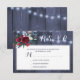 Convite de casamento de rosas peônia brancas e burgundy elegante rústico com resposta de rsvp em cartão de fundo de madeira de celeiro azul-marinho escuro com cordas de luzes cintilantes. +++++++++ Papelaria correspondente disponível no conjunto.