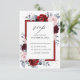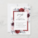 Cartão de confirmação de presença de casamento floral temático em ardósia rosa empoeirado e borgonha com escolha de refeição, apresentando um buquê elegante de flores em borgonha, vinho, azul poeirento, rosado, rosas e botões de peônia e folhas de eucalipto verde poeirento e moldura geométrica neutra com brilho falso vermelho. Por favor, entre em contato comigo para qualquer ajuda na personalização ou se precisar de qualquer outro produto com este design