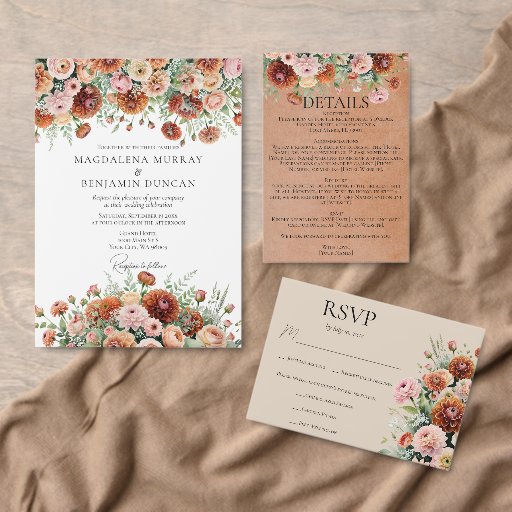 Design floral Elegante de aquarelas, com flores de dahlia, ranúculus, rosas, hálito de bebê e verde-azul. Este buquê romântico apresenta uma rica paleta colorida de cor laranja-ferrugem, combinada com verde-sábio, champanhe e tons rosa-claros. Ideal para casamentos outono, temas de blog e eventos inspirados em vintage. Perfeito para chic rústico, boêmia moderna ou estilos de casamento de jardim.