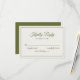Cartão RSVP Elegante em creme e verde-oliva-suja — refinado, romântico e eterno. Esta placa RSVP do tipo retrato de 3,5" x 5" apresenta uma frente de creme suave, limitada por um delicado quadro verde, acentuado com uma caligrafia graciosa. "Resposta gentil" aparece em um script grande e fluente, seguido de uma data RSVP personalizável, uma linha para nomes de convidados e três opções de resposta clássicas: Aceita Felizmente, Recusa Infelizmente e Atendimento de Número. O verso mostra uma parte verde para um acabamento quente e polido. Perfeito para temas de casamento minimalistas, formais ou românticos, este RSVP coordena-se facilmente com os nossos convites e as nossas essências de suite de casamento. Complete a sua suíte de casamento com esta inserção de RSVP de eternos — projetada para harmonia, elegância e facilidade.