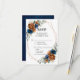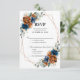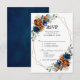Convite de casamento elegante com tema floral terroso laranja, azul marinho, apresentando um buquê elegante de rosas e peônias azul marinho, cor terracota e folhas de eucalipto verde. Por favor, entre em contato comigo para qualquer ajuda na personalização ou se você precisar de qualquer outro produto com este design.