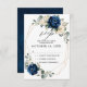 Cartão de confirmação de presença floral azul marinho escuro com buquê elegante de azul marinho, azul real, branco, dourado, champanhe marfim, rosa cor-de-rosa, rosa, ranúnculo, peônia, botões de flores e folhas de eucalipto verde-sage e aquarela elegante com moldura geométrica neutra brilhante. Por favor, entre em contato para qualquer ajuda na personalização ou se precisar de qualquer outro produto com este design.