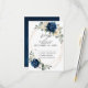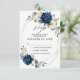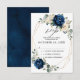 Cartão de resposta floral azul marinho escuro com buquê elegante de azul marinho, azul real, branco, dourado, champanhe marfim, rosa desmaiado, hidrangeia, ranúnculo, peônia, botões de flores e folhas de eucalipto verde-sage e aquarela elegante com moldura geométrica neutra brilhante. Por favor, entre em contato para qualquer ajuda na personalização ou se precisar de qualquer outro produto com este design.