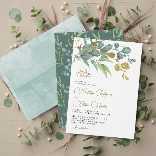 Cartão RSVP Casamento Islâmico Rustic Eucalyptus Dourado Branc