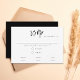 Cartão RSVP Mínimo e moderno de Casamento Branco Negro com opção de refeição para seus convidados de casamento, incluindo uma linha de texto sobre quantos assentos você reserva - uma forma excelente de deixar seus convidados de casamento saberem quantas pessoas são convidadas. Design contemporâneo e moderno com Script manuscrito. Mais designs de cartão RSVP estão disponíveis nesta coleção de artigos de papelaria de casamento.