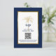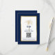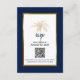 Forneça aos seus convidados para responder ao seu convite de casamento e explore seu site de casamento com os detalhes elegantes de RSVP e design de código QR com script moderno, azul-marinho e ouro, incluindo uma palmeira artística e uma estrutura de ouro metálico na frente do cartão. Um fundo azul marinho está na frente e atrás.