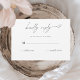 Mantenha seus convites de casamento limpos e na moda com este Cartão RSVP de Casamento Negro e Branco Minimalista. Projetada com uma tipografia elegante e uma paleta monocromática de eterno, esta placa fornece aos convidados uma maneira simples, mas sofisticada, de responder ao seu grande dia. Perfeito para casamentos modernos, comemorações de gravata negra, eventos de chic rústicos ou casamentos de destino, esta design versátil complementa qualquer tema de casamento. Personalize com seus nomes, data do casamento e prazo RSVP para uma peça de papelaria personalizada que se coordena perfeitamente com o resto de sua suíte de casamento. Impresso em estoque de cartão de alta qualidade com várias opções de papel, essa placa RSVP garante um acabamento polido e profissional que deixa uma impressão duradoura. Compare-o com convites de casamento, cartões de detalhes, menus, números de tabelas e cartas de agradecimento da mesma coleção minimalista para criar um olhar coeso para o seu evento inteiro.