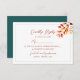 Elegante e sazonal, esta placa RSVP de casamento outono lacrimogêneo e laranja apresenta folhagem de outono de cor aquática e um layout clássico simples para coletar respostas de convidado. Com espaço para preferências de refeições e um retorno por data, é perfeito para coordenar com a sua suíte de casamento no outono. Totalmente personalizável para corresponder aos detalhes do evento e ao estilo pessoal.
