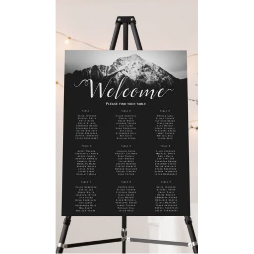 Casamento preto e branco debaixo das montanhas. Fotografia paisagística de uma montanha coberta de neve com escuridão abaixo e céu branco nublado acima. Os nomes do casal estão em caracteres pretos acima da montanha no céu e todos os detalhes estão em caracteres brancos abaixo da montanha. Produtos de casamento totalmente personalizáveis e personalizáveis.