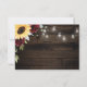 Design apresenta um fundo de grão de madeira em celeiro decorado com um elemento floral no topo que consiste em eucalipto de jardim de aquarelas, verde, rosas vermelhas de burlões e girassol. Design também apresenta as luzes de cordas reviradas com jarras de pedras leves e rústicas do país.