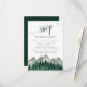 Esta bela placa RSVP apresenta um design de aquarela rústica com uma floresta alpina verde profunda com picos de montanha ao fundo. O título está escrito em uma caligrafia antiga e há espaço para seus hóspedes indicarem o número total de participantes e a escolha da refeição.