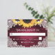 Cartões RSVP de Casamentos Russos Personalizados e Burgundy, com flores de sol, em um fundo de madeira de celeiro adornado com rendas florais brancas e luzes de cordas. Dois corações de burlap nas costas. Design de cartão perfeito para complementar sua festa de casamento rustica burguesa inspirada pelos girassóis. Itens correspondentes disponíveis para esta placa RSVP totalmente personalizável.