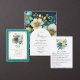 Rsvp de casamento floral teal e dourado personalizável para suas especificidades de evento.