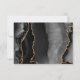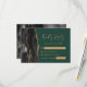 A borda esquerda desta elegante e moderna placa RSVP de casamento apresenta uma borda preta de aquarela, aparada com falso brilho dourado. O texto está em um script de manuscrito dourado e um tipo de letra copperplate em um fundo verde esmeralda. O verso apresenta um design de agate preto e dourado correspondente.