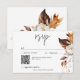 Capturar a essência da elegância do outono com o nosso cartão de resposta de casamentos de cor aquosa, com tema de queda, com um código QR. Uma tapeçaria de matizes quentes, incluindo marrom, ferrugem, bronzeado e rosa-pincelado, nossa design apresenta uma mistura graciosa de hidrangeas, peonias brancas e folhas de queda encantadoras. O fundo branco nítido fornece a canvas perfeita para que os detalhes de seu evento brilhem. Adotar o romance e a sofisticação da estação com este design impressionante, definindo o tom para uma celebração tão memorável quanto as folhas em mudança. Peça o seu hoje e convide seus convidados a se juntar à beleza das festividades do outono. Criado pela imprensa simplesmente de farmácia.