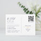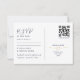 Este cartão moderno de RSVP oferece o melhor dos dois mundos - opções tradicionais de resposta pelo correio e um código QR digital para respostas online. Estilizado com fontes serifadas elegantes e fontes script, um gráfico romântico de corda dourada em forma de coração e um layout minimalista, é perfeito para casamentos formais e com noivos conectados. O verso inclui um endereço de devolução e espaço para selo, enquanto a frente oferece opções de refeição personalizáveis e formato de resposta. Um adendo elegante e funcional ao seu conjunto de casamento em azul marinho e dourado.