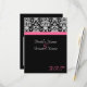 Cartão de confirmação para combinar com o nosso convite de casamento com fundo preto elegante e sotaque rosa magenta, rosa quente. Fundo preto fresco e elegante com sotaque damasco preto e branco, e faixa de sotaque horizontal colorida. Personalize online com os detalhes do seu casamento.