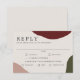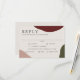 Um cartão-resposta de casamento com estilo artístico que transmite elegância simples, este design tem uma rica paleta de cores de outono em tons de vinho burgundy, terracota e formas abstratas verdes caçador ao longo das bordas do design. Um fundo bege combina bem com as cores de outono. A fonte é nítida e elegante em sua simplicidade. Este cartão de RSVP tem um modelo de texto que inclui seleções de pratos do menu para que seu convidado escolha sua opção de refeição preferida. Você pode personalizar as opções de refeição com suas próprias palavras, bem como a data de RSVP necessária.