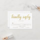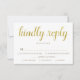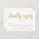 Esta elegante carta RSVP é perfeita para um ouro de aniversário. O cartão de resposta branco e dourado apresenta a frase "gentilmente responda" escrita em uma bela caligrafia dourada. Personalize o texto abaixo com a data de resposta e as opções de refeição.