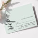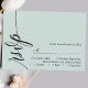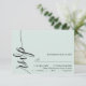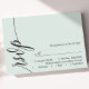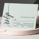 Marque sua presença com um toque de elegância eterno. Este cartão verde de RSVP verde de menta pastel apresenta um roteiro de caligrafia gracioso, adicionando um toque de sofisticação à sua papelaria de casamento. O design minimalista garante clareza, enquanto a elegante fonte dá um toque de formalidade. Complementa perfeitamente o seu simples tema de casamento, este cartão RSVP se mistura sem esforço com estética romântica, química ou sofisticada. Personalize-o com seus nomes e detalhes de casamento para criar um pacote de resposta coesa para seu dia especial.