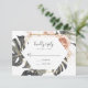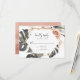 Cartão RSVP de casamento Elegante e tropical com a data de RSVP e o costume aceita/declina a redação cercada por uma falsa estrutura geométrica dourada, folhas tropicais verdes escuras e peônias e orquídeas embaçadas. A parte de trás dos cartões de resposta do casamento apresenta um fundo de cor-de-água escamoteada. Projetado para coordenar com nossa coleção de casamento Tropical Boho.