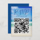 Este belo cartão RSVP de casamento de praia com o código QR do site apresenta uma linda foto das ondas do oceano para um casamento de destino. Fotografia de praia bonito, combinada com elegante tipografia azul, cria um cartão de resposta chic e moderno a um evento em uma ilha tropical.