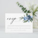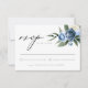 Este cartão RSVP de casamento apresenta florais azuis empoeirados de aquarela e uma fonte elegante de caligrafia. Edite facilmente o texto do seu evento. Este RSVP é perfeito para seu casamento ou evento na montanha, rústico, boêmico ou verde de inverno.
