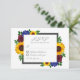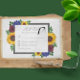 Design apresenta girassóis, rosas e flores silvestres elegantes com uma paleta de cor amarela, burgundy e azul ouro. Design também apresenta uma estrutura de cinza de carvão. Você pode alterar a cor de fundo na parte frontal e na parte traseira para a cor de sua escolha ou deixar ambas definidas como brancas.