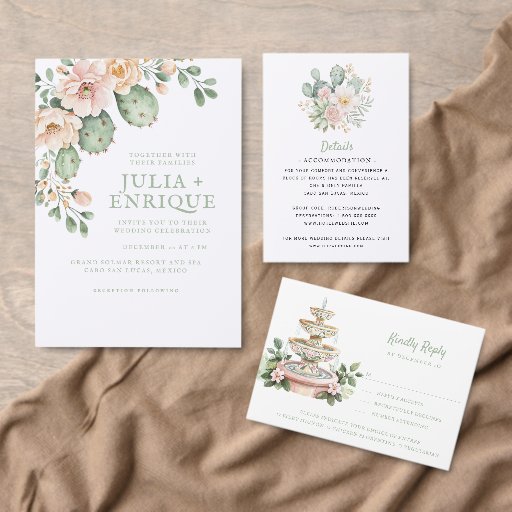 Esta bela placa RSVP do cacto apresenta design de aquarela perfeita para o seu casamento no deserto. As cores utilizadas incluem: verde-azeitona, verde-sábio e rosas claro.