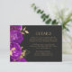 Este cartão de detalhes romântico de casamento floral, sangrento e escuro apresenta uma borda de flores roxas disparadas com folhagem de folhas falsas de ouro. Os nomes do casal aparecem em fontes clássicas de serifa dourada, com o texto restante em itálico, sobre fundo off-black.