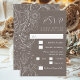 Este elegante cartão rsvp de casamento vem com uma opção de refeição para hóspedes e apresenta um delicado design floral ornamental com flores, pássaros e folhas sobre uma cinza marrom empoeirada. O texto combina o script manuscrito e as fontes serif para uma aparência na moda e moderna. Perfeito para um casamento outono de inverno ou outono.