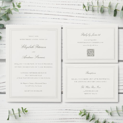 Celebrate your wedding with this ecru modern classic formal romance RSVP, perfect for a black tie wedding, elegant ballroom reception, or formal evening celebration. Designed for neutral palette weddings, luxury ceremonies, and timeless romantic events, this style complements tuxedo and gown dress codes, upscale venues, and sophisticated indoor settings. Ideal for classic weddings, minimalist formal themes, and refined traditional celebrations, this RSVP can be personalized with guest names, meal selections, and response details, with space for wedding website or QR code options. A polished choice for ballroom weddings, black tie receptions, and elegant venue celebrations, helping you create a cohesive and memorable wedding experience.
