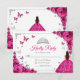 Fuchsia pink silver and white Quinceanera RSVP reply card. Features brunette girl in ball gown dress, script font, silver butterflies, hot pink roses and tiara. Perfect for an elegant princess style glam celebration. Personalize with your own details.