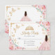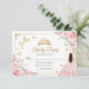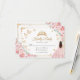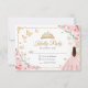 Pink, gold and white Quinceanera RSVP reply card. Features brunette girl in ball gown dress, script font, gold butterflies, blush pink roses and tiara. Perfect for an elegant princess style glam celebration. Personalize with your own details.
