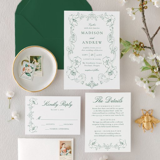Complete your wedding stationery with this Elegant Green Ornate Frame Wedding RSVP Card, offering a classic design for estate and garden weddings. The layout features refined calligraphy and traditional serif lettering with space for guest attendance and meal preferences. A rich green floral accent at the bottom grounds the design with timeless character, making it well-suited for historic venues, outdoor formal ceremonies, and traditional green wedding themes.